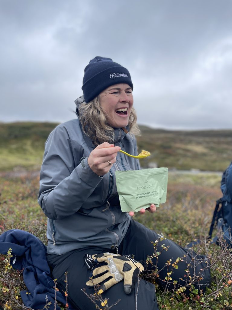 Stärkta i benen studsade vi upp de 12 km upp till fjällstationen. Fördelen med vissa varumärke är att de har en ”filline” på insidan av påsen som underlättar när man häller på vatten, då underlaget inte alltid är slätt. Vi hade med oss varmt vatten på termosar men friskt vatten finns ofta att hämta i närmsta fjällbäck och bara värma. Så slipper man bära vatten.